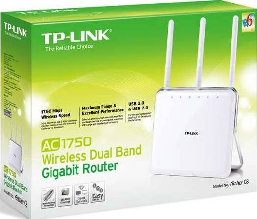 AC1750 Wireless Dual Band Gigabit Router Archer C8 Supports 802.11ac standard – the next generation of Wi-Fi Simultaneous 2.4GHz 450Mbps and 5GHz 1300Mbps connections for 1.75Gbps of total available bandwidth 3 dual band detachable antennas provide maximum Omni-directional wireless coverage and reliability Beamforming technology delivers highly efficient wireless connection USB 3.0 + USB 2.0 Ports – easily share a printer locally and files & media with networked devices or remotely via FTP server