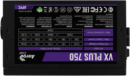 Aerocool VX Plus 750 Non-Modular Power Supply, 750W Power, ATX 12V 2.3 Compatible, Silent 120mm Fan, Thermal Fan Speed Control, Active PFC, Black | VX-PLUS-750W
