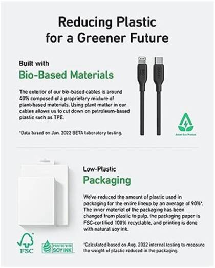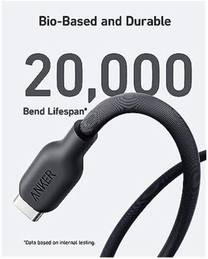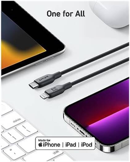 Anker 542 USB-C To Lightning Cable Bio-Based Design: The exterior of the cable body is built using bio-based materials from plants like corn and sugar cane. Bio-Based and Durable: With a 20,000-bend lifespan, this cable is more than ready to handle… The Anker 541 USB-C to Lightning Cable (Bio-Based 3ft) combines eco-friendly design with durability and performance. Made from bio-based materials derived from plants like corn and sugar cane, the cable body is designed to reduce environmental impact while enduring the rigors of daily use, with a 20,000-bend lifespan for lasting durability. MFi certified, it ensures perfect compatibility with all Lightning devices, including iPhone and iPad, and supports up to 30W fast charging for rapid power-ups.