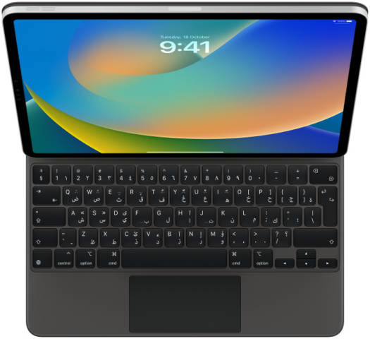 Magic Keyboard for iPad Pro 12.9‑inch (6th generation) — Arabic — Black O verview The Magic Keyboard is an amazing companion for iPad Pro 12.9-inch. It features an incredible typing experience, a trackpad that opens up new ways to work with iPadOS, a USB‑C port for pass-through charging, and front and back protection. The Magic Keyboard has a floating cantilevered design, allowing you to attach iPad Pro magnetically, and smoothly adjust it to the perfect viewing angle for you.