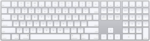 Magic Keyboard with Numeric Keypad – US English – Silver Overview Magic Keyboard with Numeric Keypad features an extended layout, with document navigation controls for quick scrolling and full-size arrow keys for gaming. A scissor mechanism beneath each key allows for increased stability, while optimized key travel and a low profile provide a comfortable and precise typing experience. The numeric keypad is also great for spreadsheets and finance applications. And the built-in, rechargeable battery is incredibly long-lasting, powering your keyboard for about a month or more between charges. 1