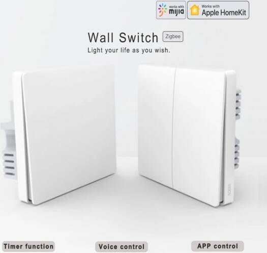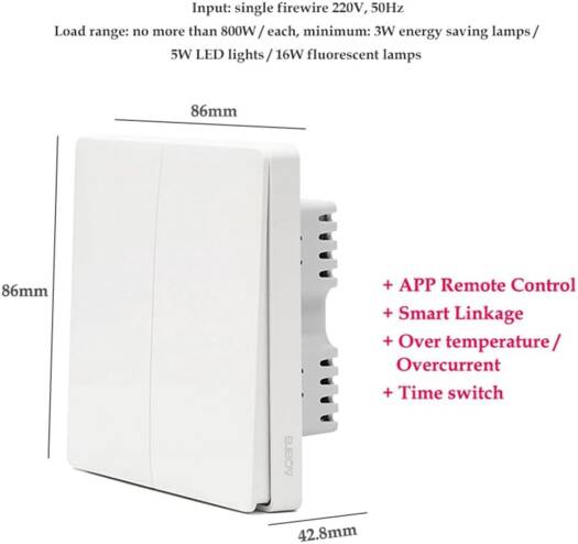 Aqara Zigbee 3.0 hub is required Based on the Zigbee 3.0 wireless communication protocol, the Aqara Smart Wall Switch D1 is a smart switch that turns on and off the power of lights and other connected devices. After binding with an Aqara hub, it can implement remote control via the Aqara Home app, timed control, power detection, power statistics and other functions, and can work with other smart devices in smart home automations. Brand: Aqara Material: Plastic Color: White Wireless Protocol: Zigbee Type (Access Control): Single /Double / Triple Access Control Switch Operating humidity: 5% 95%RH (non-condensing) Operating temperature: 5„ƒ-+60„ƒ Load range: ¤800W / circuit, 3W energy saving lamp / 5W LED lamp / 16W fluorescent lamp at minimum Standard: Q/QLML007-2016 Input voltage: 220V, 50Hz for single live line Dimension: 86 * 86 * 15.12mm Product weight: 0.123kg Package weight: 0.179kg Product size (L x W x H): 8.50 x 8.50 x 4.20 cm Package size (L x W x H): 8.60 x 8.60 x 4.50 cm Notes: Aqara Hub is required and sold separately