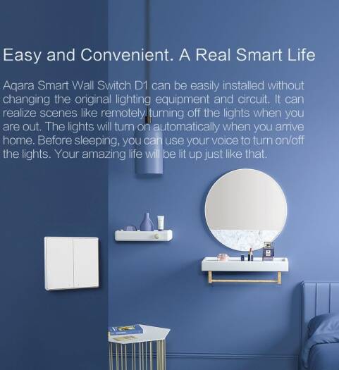 Based on the Zigbee 3.0 wireless communication protocol, the Aqara Smart Wall Switch D1 is a smart switch that turns on and off the power of lights and other connected devices. After binding with an Aqara hub, it can implement remote control via the Aqara Home app, timed control, power detection, power statistics and other functions, and can work with other smart devices in smart home automations.