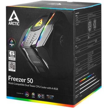 Arctic Freezer 50 With ARGB Controller Multi Compatible Dual Tower CPU Cooler, Fluid Dynamic Bearing, Up to 140mm Fan Speed, 200–1800 RPM | ACFRE00080A