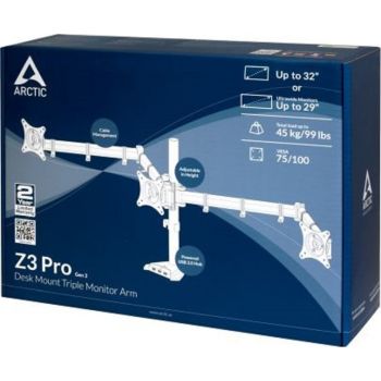 Whether you use it as your workstation or your battle station, the ARCTIC Z3 Pro (Gen 3) monitor arm is the tool you need to keep your desk clutter free, allowing you to increase productivity and level up your gaming. If you spend a lot of time in front of the screen, you'll quickly come to appreciate the ergonomic advantages of the Z3 Pro (Gen 3), especially the ability to customize your viewing angle. Finding the optimal setting for your screens improves your posture. Whether you want to adjust the height, angle or screen orientation, the Z3 Pro (Gen 3) enhances the ergonomic capabilities of your desk and office chair, offering you comfort and adaptability. The ARCTIC Z3 Pro (Gen 3) monitor arm supports the latest ultrawide monitors (up to 29 inches) with ease. Classic 16:9 monitors are also compatible (up to 32 inches). The Z3 Pro (Gen 3) supports monitors of 15 kg/33 lbs per arm. The mounting head of the ARCTIC Z3 Pro (Gen 3) makes installation and subsequent alignment changes uncomplicated and easy to manage. It doesn't matter if you want to slightly tilt your monitor or turn it 180 degrees – the only tools you need are your hands.