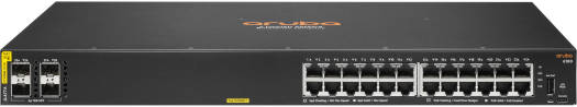 Aruba 6100 24-Port Gigabit Switch w/ SFP+, 128 Gb/s Capacity, 95.2 Mpps Rate, 65W Power x2, 4 x 10G SFP+ Slots, Black | JL678A