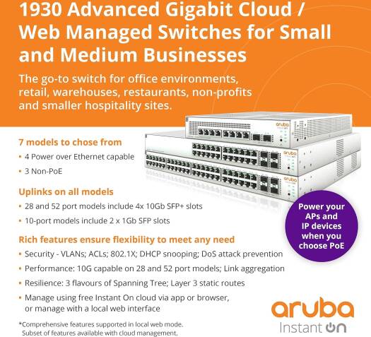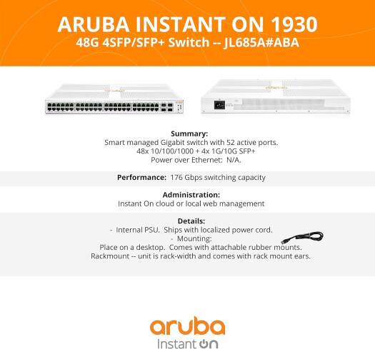Overview:Aruba Instant On 1930 52-Port Gigabit Ethernet Smart Cloud / Web Managed Switch w/ 48 x GE, 4x 1G/10G SFP+ | JL685A US cord | Rackmount | Fanless | L2+ RoutingFor small and growing businesses, a reliable and secure network plays a critical role in the success of your business. In today's connected world, home and remote office environments also need fast, affordable, reliable networking. All need a network solution that gives peace of mind, allowing you to focus on your business pirorites, elevated connected experiences, and not on managing your network. Aruba Instant On makes it easy to keep network users happy, mobile and IoT devices connected, and your network secure. The Aruba Instant On 1930 switches features advanced, smart-managed, fixed configuration Gigabit switches designed for small businesses that are easy-to-deploy and affordable. Theyre made to handle todays bandwidth-heavy applications like voice and video conferencing, enabling consistent connectivity to enhance performance.Highlights:Simplicity at its bestPlug-and-play switches that work together with Instant On APs right out of the boxMobile app to easily setup, monitor and manage your networkSecurity you can count onProtect your network from unauthorized access with IEEE 802.1X and VLANsAutomatic denial-of-service (DOS) monitors and protects the network against malicious attacksWe've got you coveredNo extra licensing or subscription feeIndustry-leading limited lifetime warranty and support