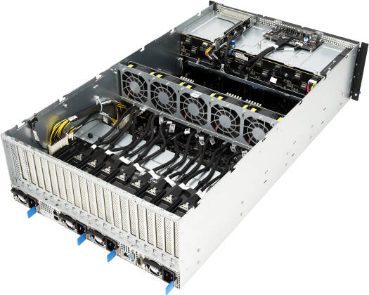 ESC8000A-E12 AMD EPYC™ 9004 dual-processor 4U GPU server that supports eight dual-slot GPUs, liquid cooling solution, up to 24 DIMM, 11 PCIe 5.0 slots, Dual NVMe, four 3000W Titanium power supplies, OCP 3.0 and ASMB11-iKVM Features Powerful performance: Powered by AMD EPYC 9004 processors with 128 Zen 4c cores, 12-channel, up to 4800 MHz DDR5 and support for a maximum TDP of up to 400 watts per socket AI and HPC workloads ready: Up to eight dual-slot active or passive GPUs, NVIDIA NVLink® bridge, and NVIDIA Bluefield DPU support to enable performance scaling Power-efficient system design: Independent CPU and GPU airflow tunnels for thermal optimization and support for up to four 3000W Titanium redundant power supplies for uninterrupted operation Comprehensive cooling solutions: Designed for both liquid cooling and enhanced air cooling based on CPU TDP for versatile workloads Scale-up storage and expansion design: A total of eight bays in combination of Tri-Mode NVMe/SATA/SAS drives on the front panel and 1