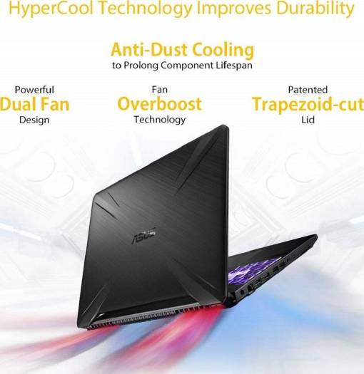 Product description Pattern name: Laptop Unite the latest AMD Ryzen 5 processor and NVIDIA GeForce GTX 1650 graphics on an 120Hz IPS-level NanoEdge display with the new ASUS TUF Gaming FX505, which delivers immersive, high-performance gaming at an affordable price. It’s tested and certified to meet military-grade MIL-STD-810G standards, ensuring the toughness and durability you need to withstand the knocks and bumps of everyday work and play. Processor: AMD Ryzen 5-3550H processor, 2.1GHz Base speed (6MB cache, up to 3.7GHz) Memory & Storage: 8GB DDR4 2400MHz RAM upgradeable upto 32GB RAM with| NVIDIA GeForce GTX 1650 GDDR5 4GB VRAM Graphics| Storage: PCIe NVMe 512GB M.2 SSD Display: 15.6″ (16:9) LED-backlit FHD (1920×1080) 120Hz Anti-Glare IPS-level Panel with 45% NTSC Operating System: Pre-loaded Windows 10 Home with lifetime validity Design & battery: 6.5mm Thin bezel | Laptop weight 2.20kg | Lithium battery 3-Cell Hypercool Technology: Anti-Dust Cooling | Powerful Dual Fan Design | HyperFan| Patented Trapezoid