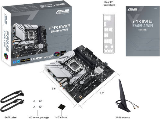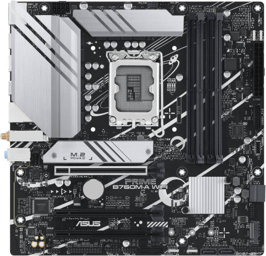 PRIME B760M-A WIFI D4 Intel ® B760 (LGA 1700) mATX motherboard with PCIe 4.0, DDR5, two M.2 slots, Realtek 2.5Gb Ethernet, Wi-Fi 6, DisplayPort, Dual HDMI™, SATA 6 Gbps, rear USB 3.2 Gen 2, front USB 3.2 Gen 1 Type-C ® , Aura Sync Intel ® LGA 1700 Socket: Ready for 13 th and 12 th Gen Intel ® processors Ultrafast Connectivity: PCIe 4.0, two M.2 slots, Realtek 2.5Gb Ethernet, Wi-Fi 6, rear USB 3.2 Gen 2, front USB 3.2 Gen 1 Type-C ® Comprehensive Cooling: VRM heatsinks, M.2 heatsink, PCH heatsink, hybrid fan headers, and Fan Xpert 2+ Exclusive Memory Technology: ASUS Enhanced Memory Profile II and ASUS OptiMem II Aura Sync RGB Lighting: Onboard Addressa