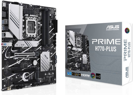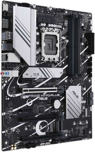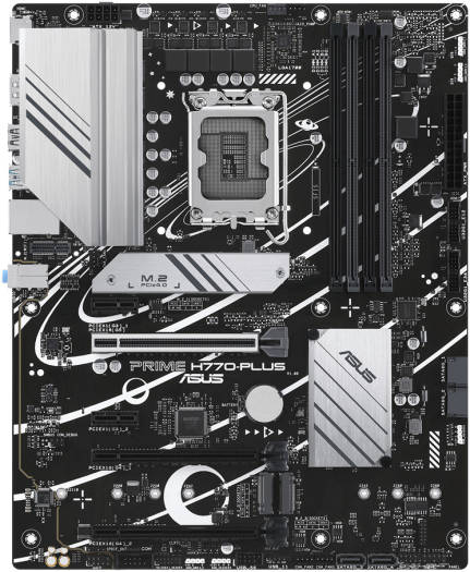 ASUS Prime H770-PLUS, an Intel ® H770 LGA 1700 ATX motherboard with PCIe 5.0, three PCIe 4.0 M.2 slots, DDR5, Realtek 2.5Gb Ethernet, DisplayPort, HDMI™, USB 3.2 Gen 2 Type-C ® , Thunderbolt™ (USB4 ® ) support, Aura Sync Intel ® LGA 1700 Socket: Ready for 13 th and 12 th Gen Intel ® processors Ultrafast Connectivity: PCIe 5.0, three PCIe 4.0 M.2, Realtek 2.5Gb Ethernet, USB 3.2 Gen 2 Type-C ® and Thunderbolt™ (USB4 ® ) header support Comprehensive Cooling: VRM heatsink, M.2 heatsink, PCH heatsink, hybrid fan headers and Fan Xpert 2+ Exclusive Memory Technology: ASUS Enhanced Memory Profile II and ASUS OptiMem II Aura Sync RGB Lighting: Onboard Addressable Gen 2 hea