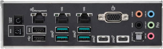 | Back Panel I/O Ports | 1 x USB 3.2 Gen 2×2 port(s) (1 x USB Type-C)5 x USB 3.2 Gen 2 port(s) (4 x Type-A + 1 x USB Type-C®)2 x USB 2.0 port(s) (2 x Type-A)1 x VGA port2 x Intel® dual 10Gb Ethernet ports1 x Realtek 1Gb Ethernet port5 x Audio jacks1 x Optical S/PDIF out port1 x BIOS FlashBack™ button1 x Clear CMOS button |