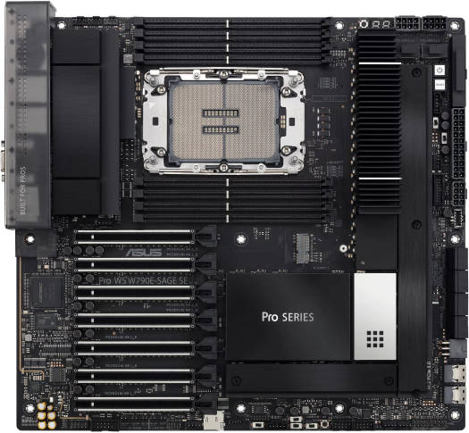 PRO WS W790E-SAGE SE Intel® W790 (LGA 4677) EEB workstation motherboard, PCIe 5.0 x16, M.2, Dual 10G LAN, Server-grade Remote Management, 14+1+1 power stages, USB 3.2 Gen 2×2 Type-C® Features Intel® LGA 4677 socket: Ready for Intel Xeon® W-3400 & W-2400 processors CPU and memory overclocking: Supports for up to 2TB of ECC R-DIMM DDR5 memory (1DPC) Ultrafast connectivity: 7 PCIe 5.0 x16 slots, Dual Intel X710-AT2 10G LAN, 3 M.2, USB 3.2 Gen 2×2 Type-C® and 2 SlimSAS Server-grade IPMI remote management: Hardware and software-level with a dedicated LAN port link to AST2600 BMC controller, plus a real-time monitoring and management software – ASUS Control Center Express Robust power and thermal design: 14+1+1 power stages, 8-pin and 6-pin PCIe power connectors, Massive VRM, chipset, M.2 heatsinks and M.2 backplates Trusted stability: Highly compatible with the latest technologies with solid QVL list and tested for 24/7 operation, vali
