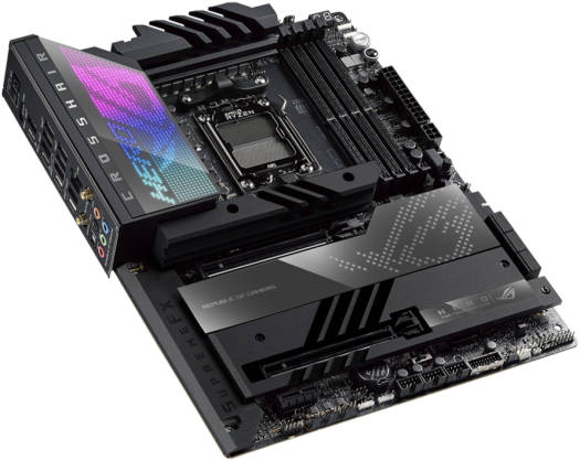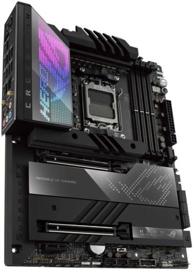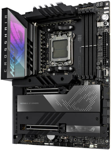 ROG CROSSHAIR X670E HERO Unyielding power delivery and robust thermal management form the indelible tenets of its creed. Hyperspeed connectivity, comprehensive PCIE 5.0 and DDR5 support, and Polymo lighting add potent layers of build personalization on top. And the finishing touches are added by exclusive utilities and overclocking controls that allow you to uniquely flex the performance of Ryzen 7000 Series processors. Define your AM5 build with the ROG Crosshair X670E Hero. AMD Socket AM5(LGA 1718) for AMD Ryzen 7000 Series Desktop Processors. Intelligent Control: ASUS-exclusive tools including AI Cooling II and Two-Way AI Noise Cancelation for easy configuration. Robust Power Solution: 18 + 2 teamed power stages rated for 110A, ProCool II power connectors, MicroFine alloy chokes and premium metallic capacitors. Optimized Thermal Design: Large VRM heatsinks plus integrated aluminum I/O cover, high-conductivity thermal pad, five M.2 heatsinks and three with embedded backplates, plus the ROG Water Cooling Zone. High-Performance Networking: Onboard Wi-Fi 6E, Intel 2.5 Gb Ethernet, and ASUS LANGuard.