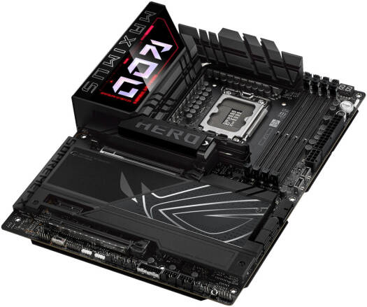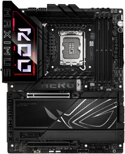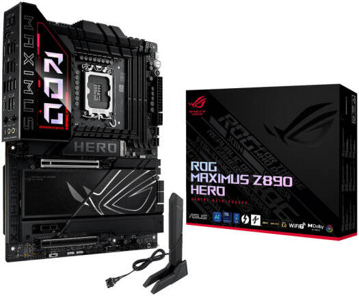ROG MAXIMUS Z890 HERO Intel® Z890 LGA 1851 ATX motherboard, Advanced AI PC-ready, 22+1+2+2 power stages, NPU Boost, DDR5 slots with NitroPath DRAM Technology, DIMM Flex, AEMP III, WiFi 7 with ASUS WiFi Q-Antenna, three PCIe® 5.0 M.2 slots and three PCIe 4.0 M.2 slots onboard with ROG M.2 PowerBoost, SlimSAS connector, PCIe 5.0 x16 SafeSlot with PCIe Slot Q-Release Slim and full support for next-gen graphics cards, two Thunderbolt™ 4 ports, USB 20Gbps Type-C® front-panel connector with Quick Charge 4+ up to 60W and USB Wattage Watcher, ASUS AI Advisor, AI Overclocking, AI Cooling II, AI Networking II and Polymo Lighting II Specifications