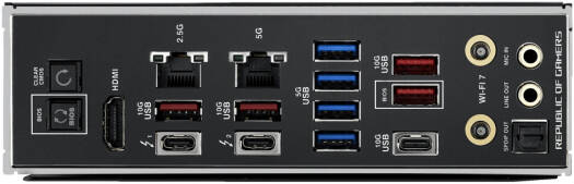 | Back Panel I/O Ports | – 2 x Thunderbolt™ 4 USB Type-C® ports- 5 x USB 10Gbps ports (4 x Type-A + 1 x USB Type-C®)- 4 x USB 5Gbps ports (4 x Type-A)- 1 x HDMI™ port- 1 x Intel® 2.5Gb Ethernet port- 1 x Realtek 5Gb Ethernet port- 2 x Gold-plated audio jacks- 1 x Optical S/PDIF out port- 1 x BIOS FlashBack™ button- 1 x Clear CMOS button |
