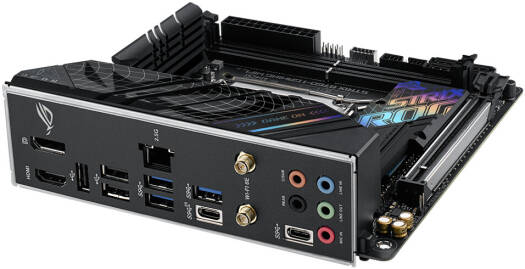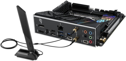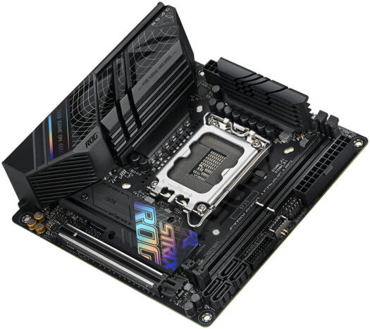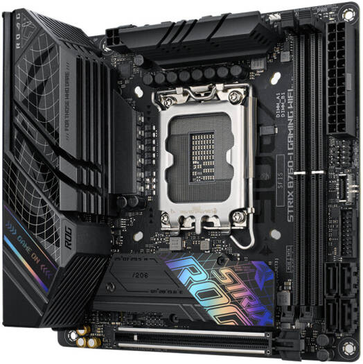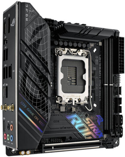 ROG Strix B760-I Intel® B760 LGA 1700 mini-ITX motherboard with 8 + 1 power stages rated to 80A, DDR5 up to 7600 MT/s, PCIe 5.0 x16 SafeSlot, two PCIe 4.0 M.2 slots, WiFi 6E, 2.5G Ethernet, USB 3.2 Gen 2×2 Type-C®, ASUS Enhanced Memory Profiles (AEMP) II, Two-Way AI Noise Cancelation, and Aura Sync RGB lighting