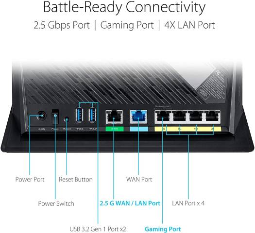 Asus RT-AX86U AX5700 Dual Band WiFi 6 Gaming Router, WiFi 6 802.11ax, Mobile Game Mode, Lifetime Free Internet Security, Mesh WiFi support, 2.5G Port, Gaming Port, Adaptive QoS, Port Forwarding New-generation WiFi 6 – Enjoy ultrafast speeds up to 5700 Mbps with the latest WiFi 6 (802.11ax) and 160MHz channels Mobile Game Mode – Minimize lag and latency for mobile gaming with just a tap on the ASUS Router app True 2 Gbps wired and wireless speeds – Aggregated 2 Gbps WAN connections, wired 2.5 Gbps port and WiFi 6 ASUS AiMesh support – Create a flexible, seamless whole-home mesh network with AiMesh-compatible routers Commercial-grade home network security – Lifetime free ASUS AiProtection Pro, powered by Trend Micro™, with WPA3 and advanced Parental Controls to protect your home Your Winning Choice for Mobile Gaming! Enjoy the fastest, smoothest WiFi gaming connections ever with the ASUS RT-AX86U dual-band WiFi 6 router. It delivers ultrafast WiFi speeds up to 5700 Mbps*, and is packed with advanced technolog