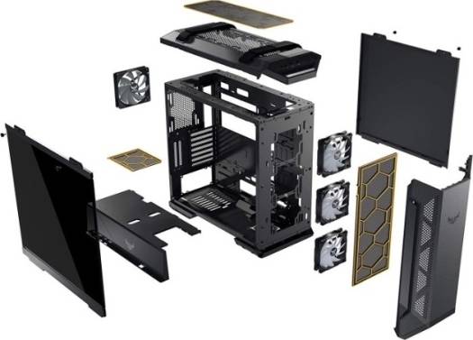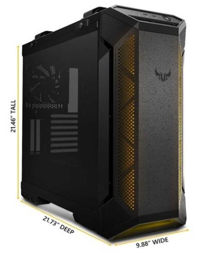 TUF Gaming GT501 Be Cool, Be Outstanding ASUS TUF Gaming GT501 case supports up to EATX with metal front panel, tempered-glass side panel, 120 mm RGB fan, 140 mm PWM fan, radiator space reserved, & USB 3.1 Gen 1 Efficient cooling: Equipped with three powerful 140mm PWM fans and up to seven mounting points for targeted airflow. Perfect for TUF Gaming mother