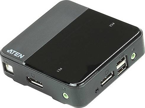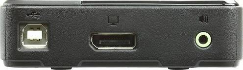 The 2-Port USB DisplayPort KVM Switch from ATEN lets you control two computer systems using a single console set featuring one DisplayPort-enabled monitor, keyboard, mouse, and pair of speakers. The KVM switch is DisplayPort 1.2 compliant and supports DisplayPort dual-mode (DP++), which enables you to use optional powered adapters that convert the connector into an HDMI or DVI interface. Video, audio, and USB cables are included for connecting the KVM switch to two computer systems. In addition to supporting mice, its USB mouse port is compatible with user-supplied USB hubs and peripherals. Once connected to the host system, the KVM switch delivers up to 4096 x 2160 visuals and 2.1-channel surround sounds. For switching between the systems, you can use the remote port selector, mouse, or hotkeys. Moreover, the switch is firmware upgradeable and powered by the host system's bus-powered port. One DisplayPort video console set controls two DisplayPort-capable computers DisplayPort 1.2-compliant <div class="descrip