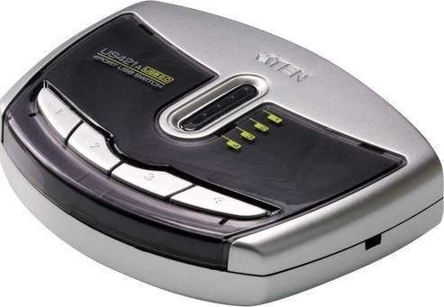 The 4-Port USB 2.0 Peripheral Switch from ATEN allows for up to 4 computer to share the use of a single USB peripheral device, such as a printer, scanner, mass storage device, etc. on a one-at-a-time basis. The peripheral focus can be accessed manually via the push-buttons on the switch, by using the configuration utility, or by the auto switch function. The USB switch is compatible with Windows and Mac and supports multifunction printers. Included with the device is a 6.0' USB cable for connecting devices to the switch. Simple port selection via push-buttons, configuration utility, or auto switch function Supports transfer rates up to 480 Mbps LED indicators display port focus Overcurrent protection <div class="j