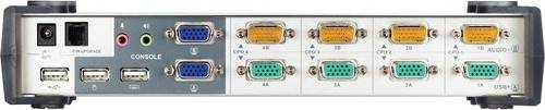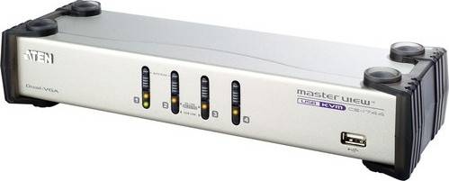 ATEN CS1744C Overview The 4-Port USB Dual-View KVMP Switch from ATEN integrates functions of video signal dual output and USB KVM switches. It allows a computer with dual-screen support to pair with two VGA/SVGA/Multisync displays via a USB keyboard and mouse. The switch also provides one USB port on each of the front and rear panels, allowing each server to share any USB peripheral device that is connected to this HUB.