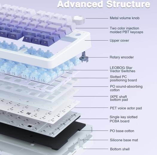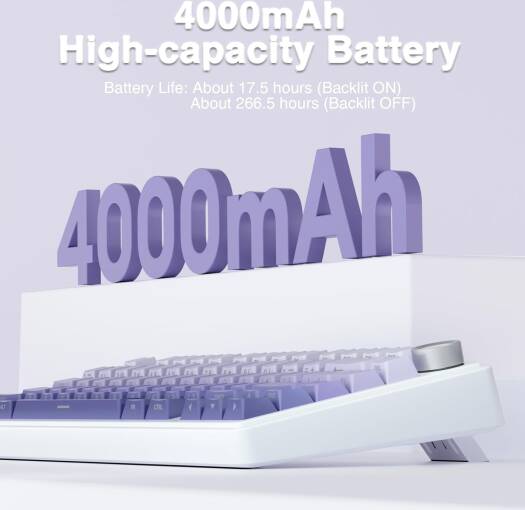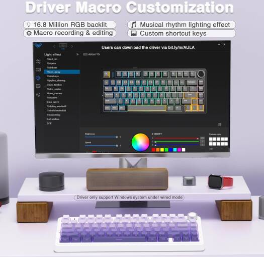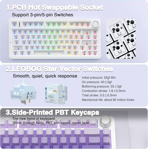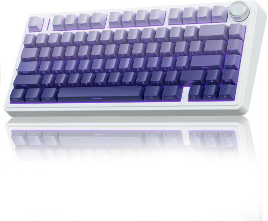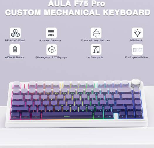 AULA F75 Pro The AULA F75 is a professional 75% layout mechanical gaming keyboard designed for performance and versatility. It features a purple gradient design, hot-swappable pre-oiled Reaper switches, and side-engraved PBT keycaps with a stylish double-shot gradient finish. The keyboard supports tri-mode connectivity—Bluetooth, 2.4GHz wireless, and USB-C wired—allowing seamless switching between up to five devices. It includes a multifunction alloy control knob for quick adjustments of volume and RGB lighting. Equipped with 16.8 million RGB colors, the F75 offers 16 preset lighting effects and 10 music rhythm modes (with driver), along with adjustable brightness and speed. With a 4.0 mm keystroke, 60±10g actuation force, and a 50 million keystroke lifespan, it ensures smooth and responsive typing. The keyboard is built with a sealing structure, five-layer silencing foam, and PCB single-key slotting for reduced cavity noise and enhanced keystroke feel.