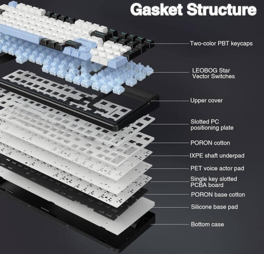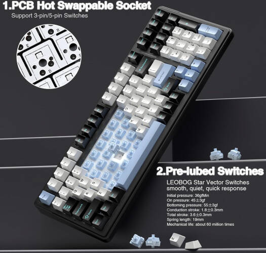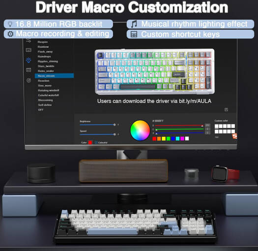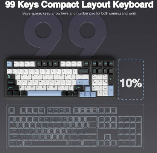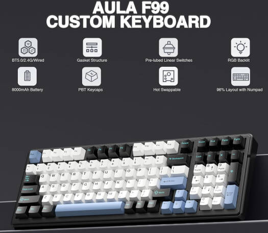 AULA F99 Gasket 98% Mechanical Keyboard, 99 Keys, Hot Swappable, Reaper Switches, Ultra Low Latency, Five Layers Noise Reduction, 8000mAh Battery, Tri-Mode Connectivity, Blue White Black | F99