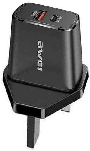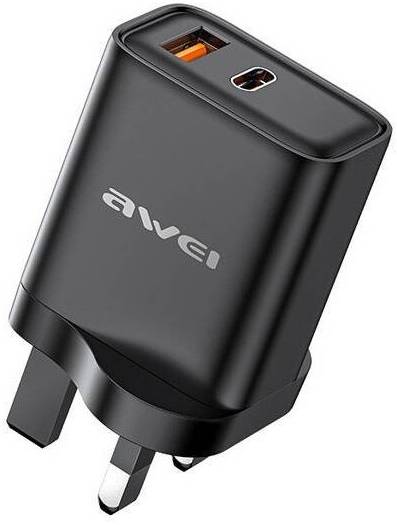 AWEI Dual Output Fast Charging Adapter, USB C AC 100-240V, 20W Power Delivery, USB C Output, UK Plug, 3 Pin Plug, Black | PD81-UK