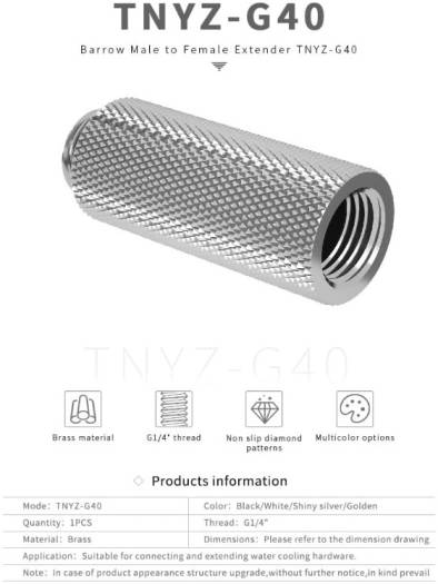Barrow G1/4″ Male to Female 40mm Extender Fitting, Brass Material, Suitable For Connecting and Extending Water Cooling Hardware, Anti Skid Design, Shiny Silver | TNYZ-G40