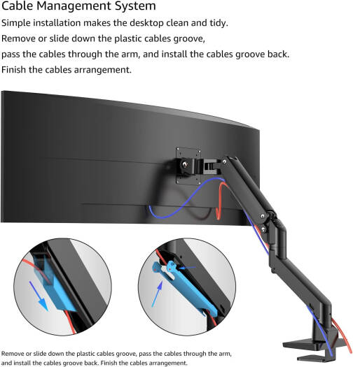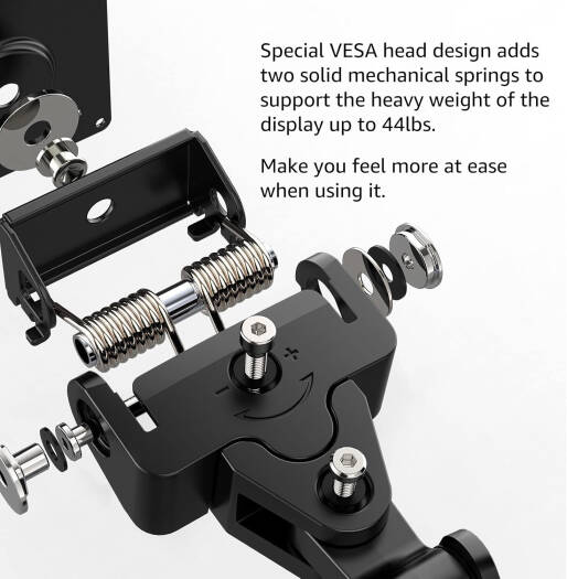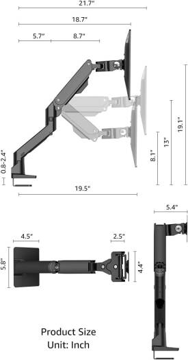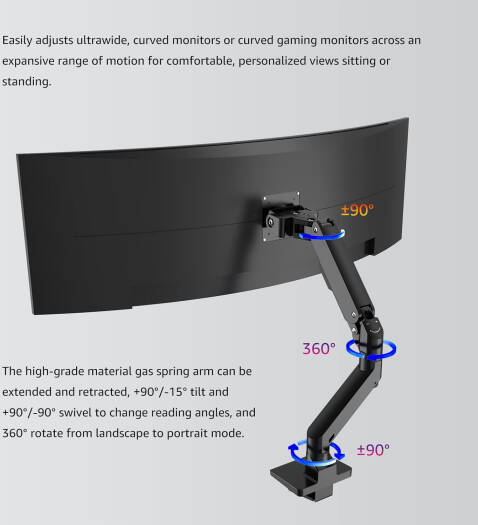 Heavy Duty Aluminum Single Gas Spring Mo nitor Arm Suit Elevate your workspace with this heavy-duty monitor arm designed for ultrawide monitors, supporting weights from 11 lbs to 44 lbs for screens between 24″ to 49″. It features adjustable viewing angles with +90°/-15° tilt, +90°/-90° swivel, and 360° rotation, allowing for personalized comfort whether sitting or standing. The space-saving design replaces bulky monitor stands and includes interchangeable C-clamp and grommet base mounts for desks up to 2.4 inches thick. Easy to install with all necessary tools included, this monitor arm enhances your productivity by optimizing your viewing experience.