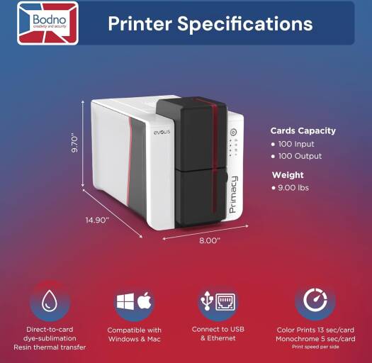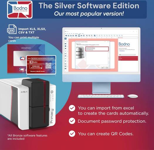 Bodno Evolis Primacy 2 Dual Sided ID Card Printer & Complete Supplies Package Silver Edition ID Software