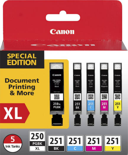 250 XL/CLI-251 5-Pack Start printing with this five-count Canon ink package. It includes three standard color cartridges, a standard black cartridge and one high-yield black cartridge, letting you can print hundreds of text documents and plenty of color images. This Canon ink package lets you stock up for future printing needs or fill your new printer for immediate use. Compatible with PIXMA IP7220,PIXMA IP8720,PIXMA IX6820,PIXMA MG5420,MG5422 US2,PIXMA MG6320,PIXMA MX722,PIXMA MX922,PIXMA MG6420,PIXMA MG7120,PIXMA MG5520,PIXMA MG5522,PIXMA MG5620,PIXMA MG5622,PIXMA MG7520,PIXMA MG6620