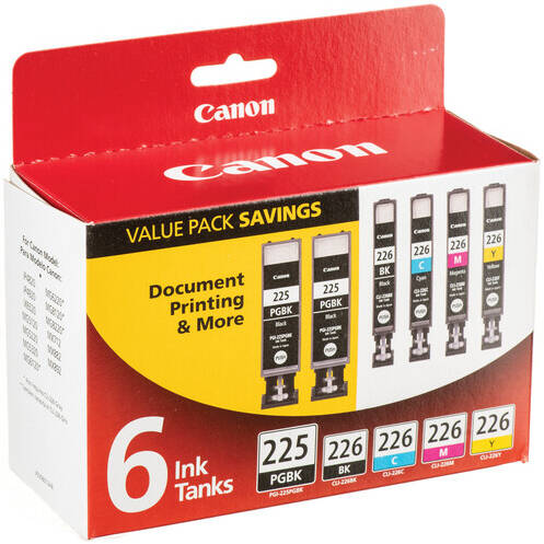 The PGI-225 & CLI-226 6-Color Ink Tank Value Pack from Canon includes two PGI-225 pigment-based black ink tanks and CLI-226 black, cyan, magenta, and yellow dye-based tanks. All six are standard yield tanks compatible with the Canon PIXMA iP4820, iP4920, iX6520, MG5120, MG5220, MG5320, MG6120, MG6220, MG8120, MG8120B, MG8220, MX712, MX882, and MX892 printers.
