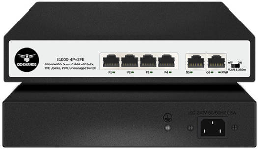 COMMANDO Scout E300 4FE PoE+, 2FE Uplinks, 65W, Unmanaged Switch. COMMANDO Scout E300 4FE PoE+, 2FE Uplinks, 65W, Unmanaged Switch 4 x 10/100Mbps Ethernet PoE+ ports 2 x 10/100Mbps Ethernet Uplink ports 4 x IEEE802.3af 15.4W PoE ports 2 x IEEE802.3at 30W PoE+ ports Switching Capacity: 1.2 Gbps Thunder Protection: ±4 KV Power: 65W Power Supply: AC AC: 180~240V 50/60Hz Fast Ethernet PoE+ Unmanaged Switch