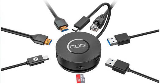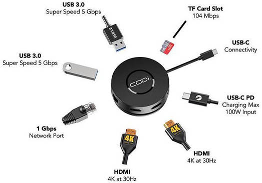 Increase your productivity with the 7 Port Mini Dock from CODi. This dock offers up to 100W of power delivery to keep your device charged, the ability to connect any peripherals, and expand your displays with up to two HDMI interfaces. Multi-screen Collaboration Mode Transfer Speed up to 5 Gbps Compact Cable Design Multi-functional (1) USB-C PD charging port max output up to 100w (2) HDMI ports supporting resolution up to 4k @30hz and 1920 x 1080 @60hz (1) 10/100/1000mbps ethernet (2) USB 3.2 Gen 1 ports: data transfer speed up to 5 GBPS (1) Micro-SD slot supporting 512g micro-SD cards Can read large-capacity micro-SD card This dock offers up to 100W of power delivery to keep your device charged, the ability to connect any peripherals, and expand your displays with up to two HDMI interfaces.
