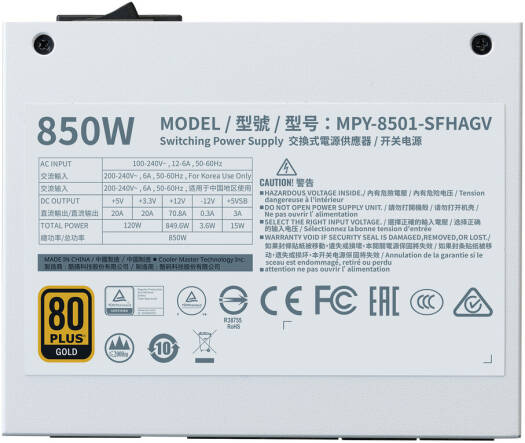V SFX Gold 850 ATX 3.0 White Edition Small But Mighty A high-performance power supply unit (PSU) from Cooler Master, designed for small form factor (SFX) PC builds. Specifications ATX Version SFX 12V Ver. 3.42 / ATX 3.0 PFC Active PFC Input Voltage 100-240V