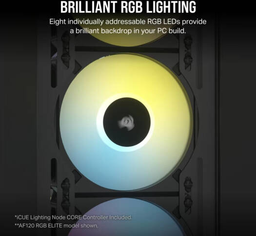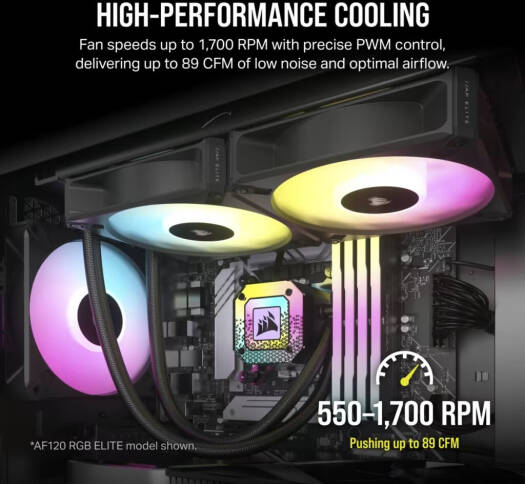 iCUE AF140 RGB ELITE 140mm PWM CORSAIR AF140 RGB ELITE High-Performance 140mm PWM fans deliver PWM-controlled fan speeds from 500 RPM up to 1,700 RPM for powerful cooling, quiet operation, and brilliant RGB lighting. Specifications Weight 0.59 Fan Size 140mm x 25mm LED Color RGB