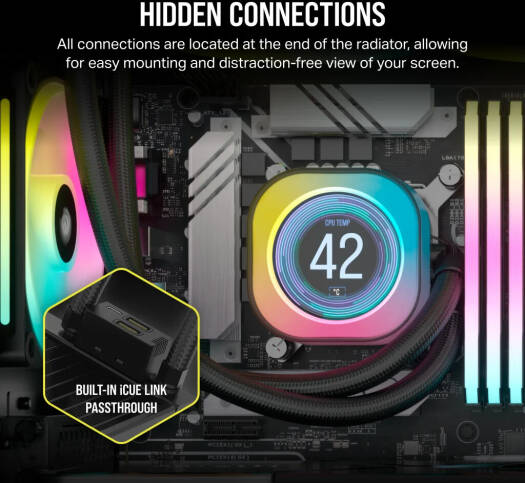 iCUE LINK H150i LCD Liquid CPU Cooler A powerful all-in-one CPU cooler with an ultra-bright 2.1″ IPS LCD screen, leveraging revolutionary iCUE LINK technology for easier, faster, and cleaner building than ever before. The CORSAIR iCUE LINK H150i LCD Liquid CPU Cooler shows off your creativity on a stunning 2.1″ IPS LCD screen whil