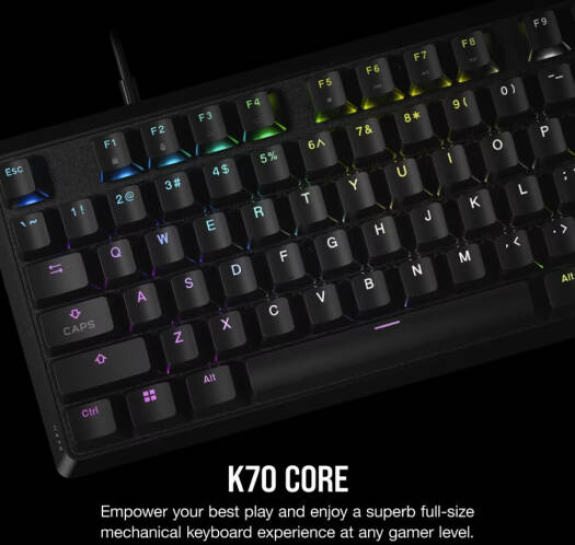 Corsair K70 CORE RGB Mechanical Gaming Keyboard Specification Specification Details CUE Software Supported in iCUE Media and Volume Controls Yes Keyboard Size Full Size Wrist Rest Included No Keyboard Report Rate 1,000Hz Keyboard Compatibility PC or Mac® with USB 3.0/3.1 Type-A port, Windows® 10, macOS® 10.15 or later, Internet for iCUE