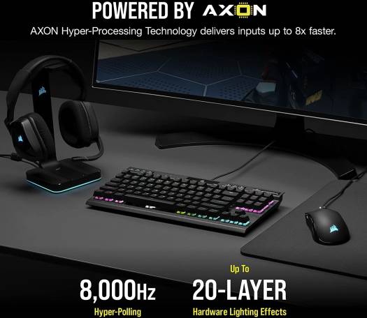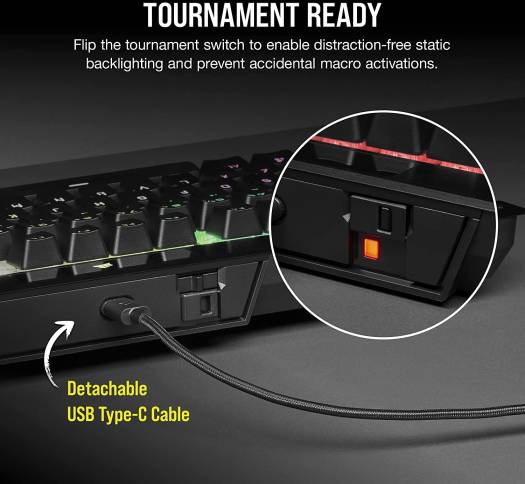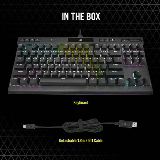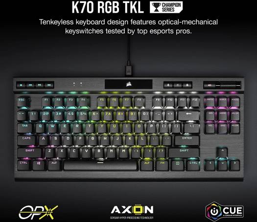 Take the CORSAIR K70 RGB TKL Optical-Mechanical Gaming Keyboard to your next competition with a compact tenkeyless form-factor, powerful CORSAIR AXON hyper-processing technology, and CORSAIR OPX RGB optical-mechanical keyswitches. Built for Champions: CORSAIR CHAMPION SERIES products are designed for and tested by top esports professionals – helping to carry you to victory with a competition-grade keyboard featuring a portable and space-saving tenkeyless form-factor, a detachable USB Type-C cable, and a tournament mode switch. CORSAIR OPX RGB Optical-Mechanical Keyswitches: Hyper-fast input with 1.0mm actuation distance and smooth linear travel, guaranteed for 150 million keystrokes Powered by CORSAIR AXON Hyper-Processing Technology: CORSAIR’s most advanced gaming keyboard experience processes and transmits inputs up to 8x faster than conventional gaming keyboards with 8,000Hz hyper-polling, 4,000Hz key scanning, and up to 20 layers of hardware RGB lighting processing while maintaining speed performance.