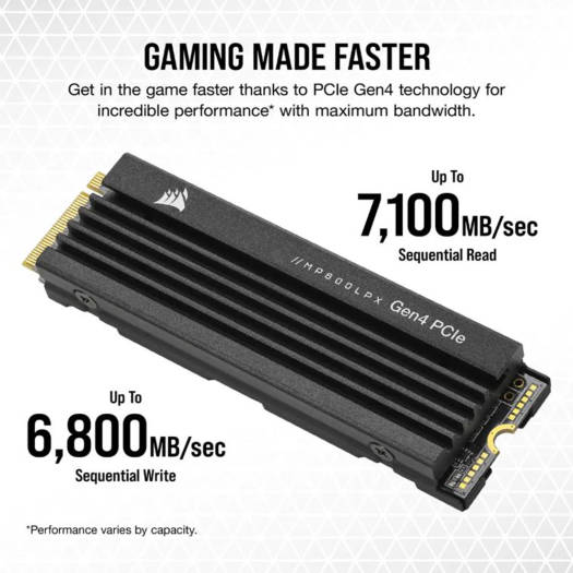 OPTIMIZED FOR PS5 The CORSAIR MP600 PRO LPX PCIe Gen4 x4 NVMe 1.4 M.2 SSD provides high-performance storage expansion optimized for PS5, boosting your console’s storage by up to 1TB. PCIe Gen4 technology achieves lightning-fast sequential read speeds of up to 7,100MB/sec and sequential write speeds of up to 6,800MB/sec, so large game files load faster than ever. The M.2 2280 form-factor and pre-installed low-profile aluminium heat spreader enable the MP600 PRO LPX to fit directly into your PlayStation 5, while meeting all PS5 M.2 size requirements. EXTREME GEN4 STORAGE PERFORMANCE Achieve extreme PS5 storage expansion up to 4TB. A low-profile aluminium heatspreader and M.2 2280 form-factor make for an ideal NVMe SSD for PS5. Expand your PS5 storage capacity with a PCIe Gen4 x4 SSD that delivers up to 7,100MB/sec sequential read and 6,800MB/sec sequential write speeds, for phenomenal read, write, and response times.