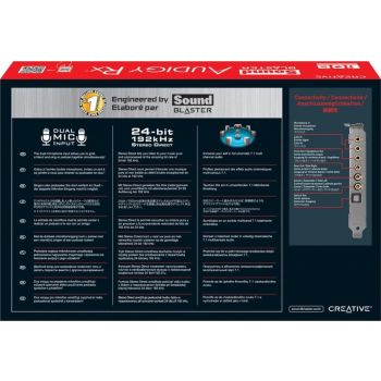 OVERVIEW Experience the wonders of multi-channel surround sound and create high-quality podcasts! Hardware-accelerated EAX effects lets you incorporate many types of sound effects with ease. Sound Blaster Audigy Rx features an SNR of 106dB, a 600-ohm headphone amp for studio monitoring, and a software suite that allows full audio customization. Premium Sound Blaster quality Enjoy premium Sound Blaster audio quality over and above basic motherboard audio with a Signal-to-Noise Ratio (SNR) of 106dB. Plus, Stereo Direct lets you listen to your music pure and unprocessed at the amazing bit rate of 24-bit 192 kHz. Enjoy cinematic surround sound The Sound Blaster Audigy Rx also lets you enjoy a truly cinematic experience, supporting up to 7.1 multi-channel speaker output. It gives
