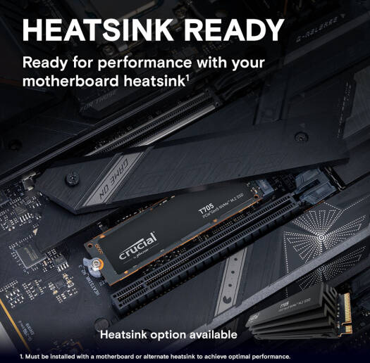 Crucial T705 Hold on tight — the Crucial® T705 Gen5 NVMe® SSD is taking Gen5 performance to the next level. Fuel your gaming, create at the speed of ideas, and power through AI applications with ease with this fully optimized Gen5 masterpiece that works with your motherboard heatsink. Specifications SSD Series T705 Interface NVMe (PCIe Gen 5 x4) Total