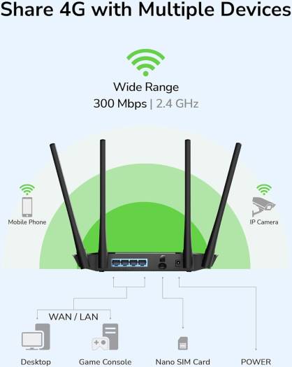 Share 4G LTE Network to Wherever You WantEnjoy Blazing Fast 4G LTE and Wi-Fi Speed. LT400 uses the latest generation 4G LTE technology to reach speeds of up to 150Mbps in download and 50Mbps in upload; it also allows you to connect via Wi-Fi with a maximum speed of 300Mbps on 2.4GHz to enjoy gaming, streaming, and much more.Specifications:- Qualcomm Chipset InsideInterface:- 4 x Ethernet Ports- 2 x LTE Antennas – 2 x WiFi Antennas – 1 x Power Jack- 1x SIM Card SlotPackage Content:-1 x 4G LTE Router-1 x Power Adapter-2 x SIM Card Adapter-1 x Ethernet Cable-1 x Installation Guide
