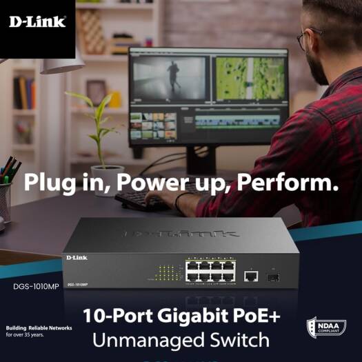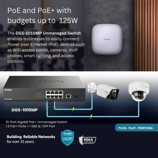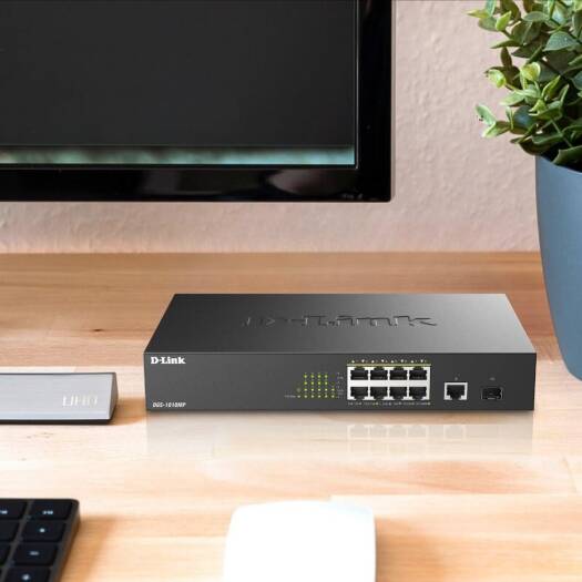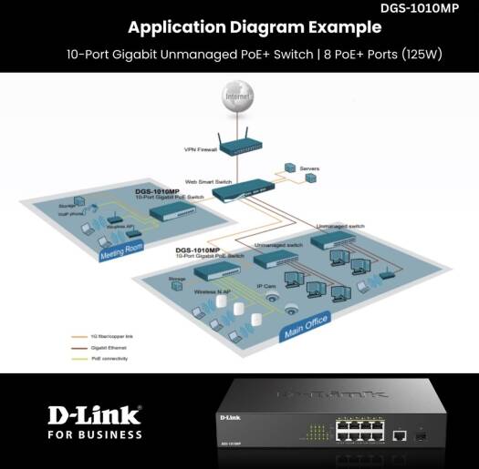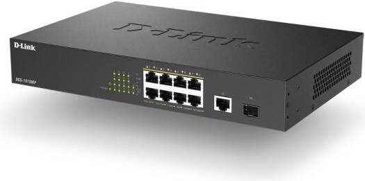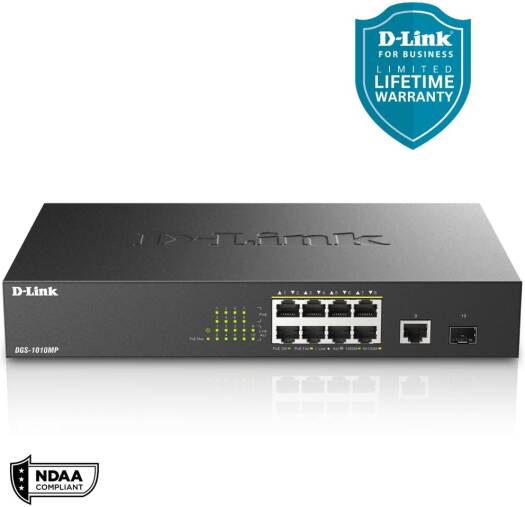 The D-Link DGS-1010MP 10-Port Gigabit PoE switch is an ideal solution for small offices and enterprise environments looking to expand their network with a set of Power over Ethernet devices such as wireless access points IP cameras and IP phones Built with small business and enterprise users in mind the DGS-1010MP is a high-speed flexible switch that features a fan less quiet design so it can be conveniently placed anywhere in a working environment The DGS-1010MP houses eight 10/100/1000Base-T ports that support the IEEE 802 3at Power over Ethernet (PoE) standard Each of the eight ports can supply up to 30W with a total combined budget of 125W The DGS-1010MP has a compact 11 design so that it can be deployed in easily accessible locations on the work floor allowing you to power a set of poe-powered devices while avoiding additional cable clutter Alternatively the standardized 1u-sized housing makes it possible to mount the switch in a standard 19 rack and be integrated into the server infrastructure