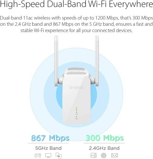 D-Link AC1200 Wi-Fi Range Extender, Dual-Band Connectivity, 2.4GHz & 5GHz Frequency, Up to 866 Mbps Signal Rate, 10/100 Mbps Ethernet Port, White | DAP-1610