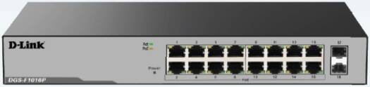 D-Link DGS-F1016P 16-Port Gigabit Unmanaged POE Switch Product Highlights Power Your Devices Supports IEE 802.3af/at POE to Power POE capable Network devices via ethernet cables without need for power adapters Eco-friendly and Economical Low-cost, innovative design runs reliably and quietly, saving energy and cutting costs without sacrificing performance Rack Mountable Rack mountable metal housing – rackmount brackets included Features Superior connectivity • 16 10/100/1000Mbps ports • 2 Gigabit SFP uplink ports • 250 watts available for POE • Flow control for protection against data loss The D-Link DGS+1016P Gigabit PoE Switch comes with 16 10/100/1000 Mbps POE ports