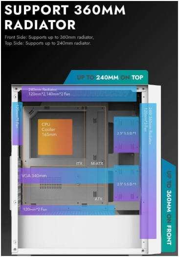 | Radiator Specification | Front – 120/240/360 mm Top – 120/140/240 mm Rear – 120 mm |