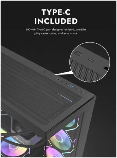 DS900 ATX PC Case Black Key Features 270 degree Panoramic design without barrier Support up to 10 fans and 360mm radiator Full coverage dust proof USB Type-C Included